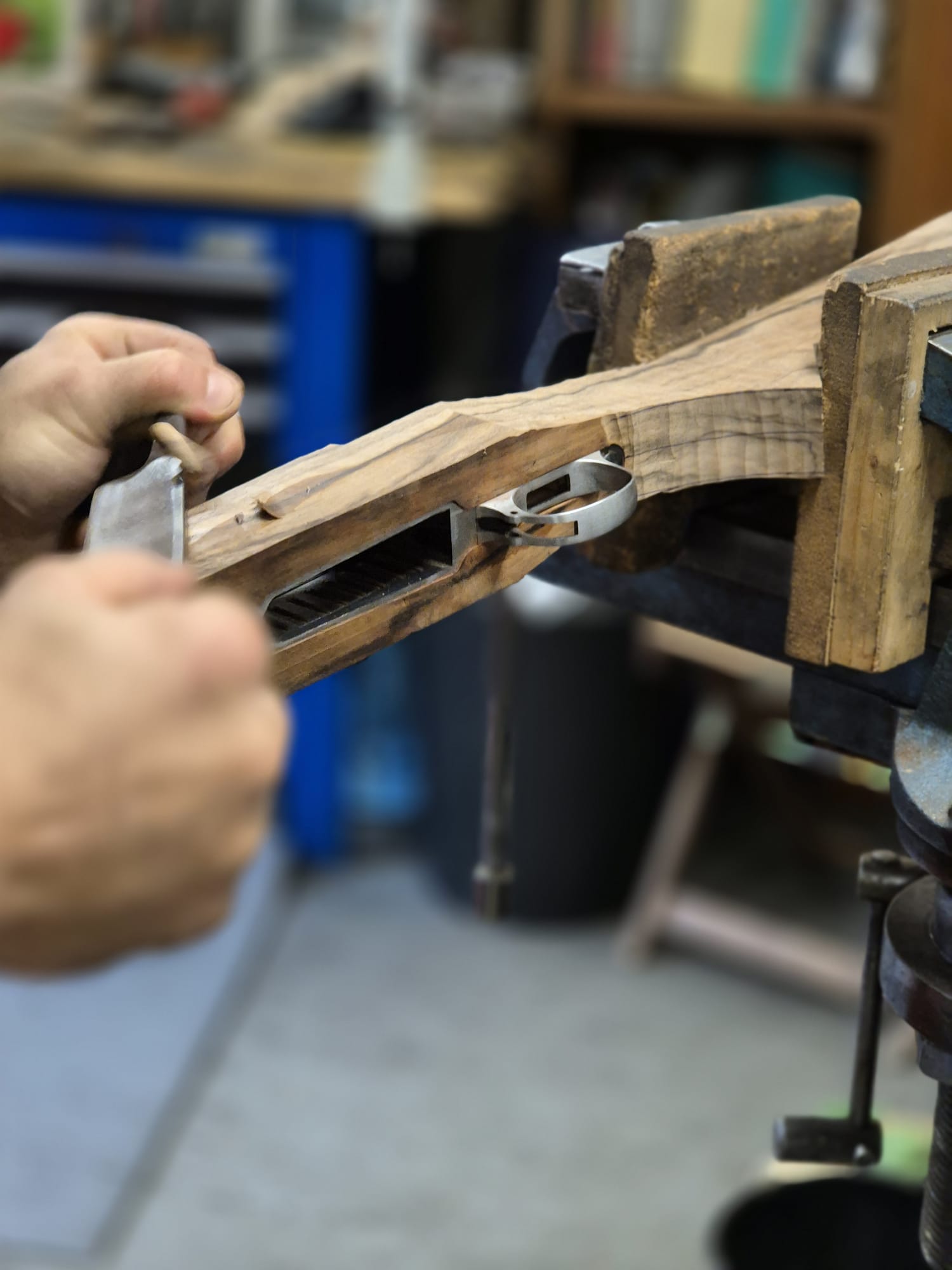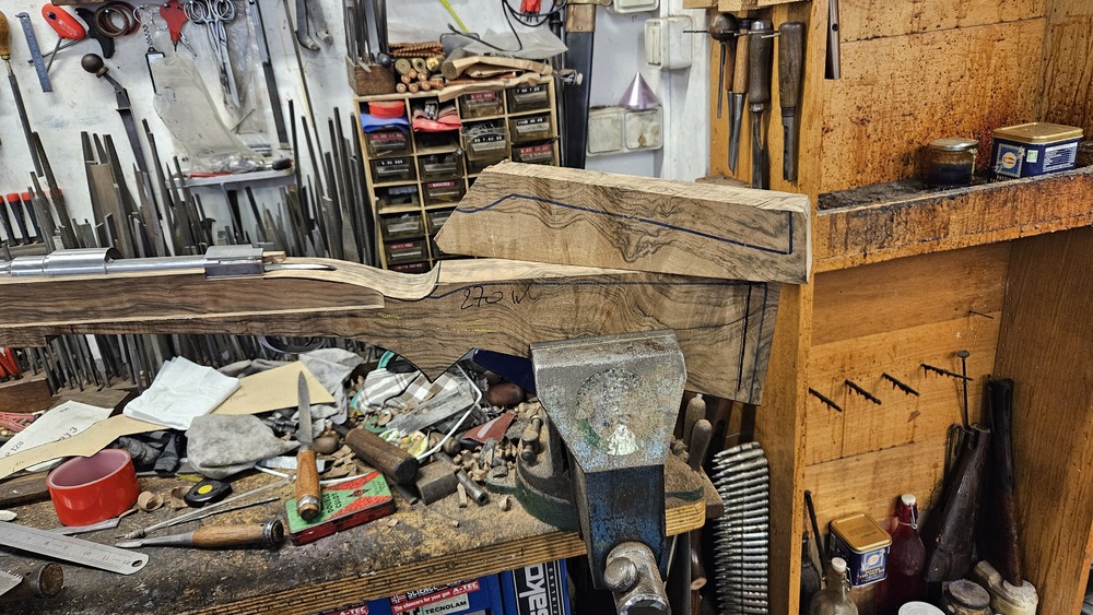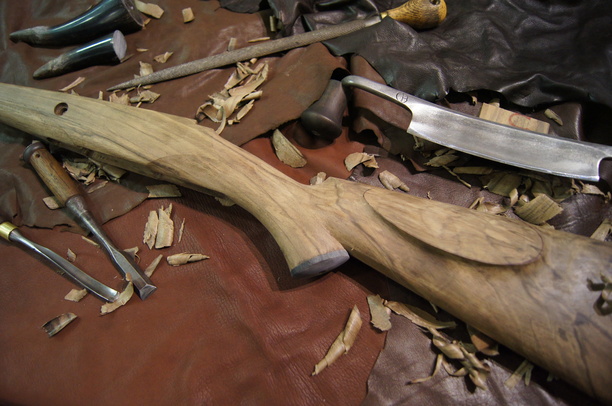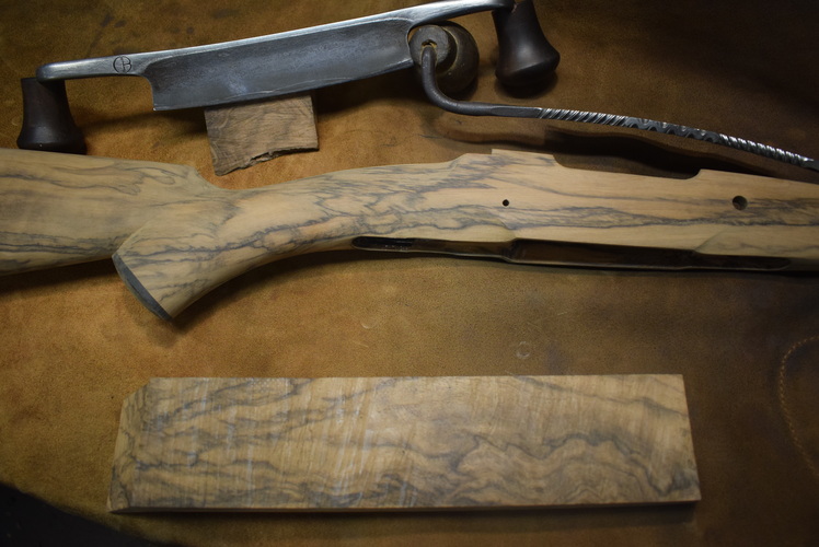 Vous choisissez votre ébauche de bois parmi notre sélection, puis nous mettons à bois votre mécanisme, enfin, à l'aide d'outils traditionnels : plane, râpes, rabots, ciseaux à bois, etc...Nous taillons la crosse à la main, à vos mesures.