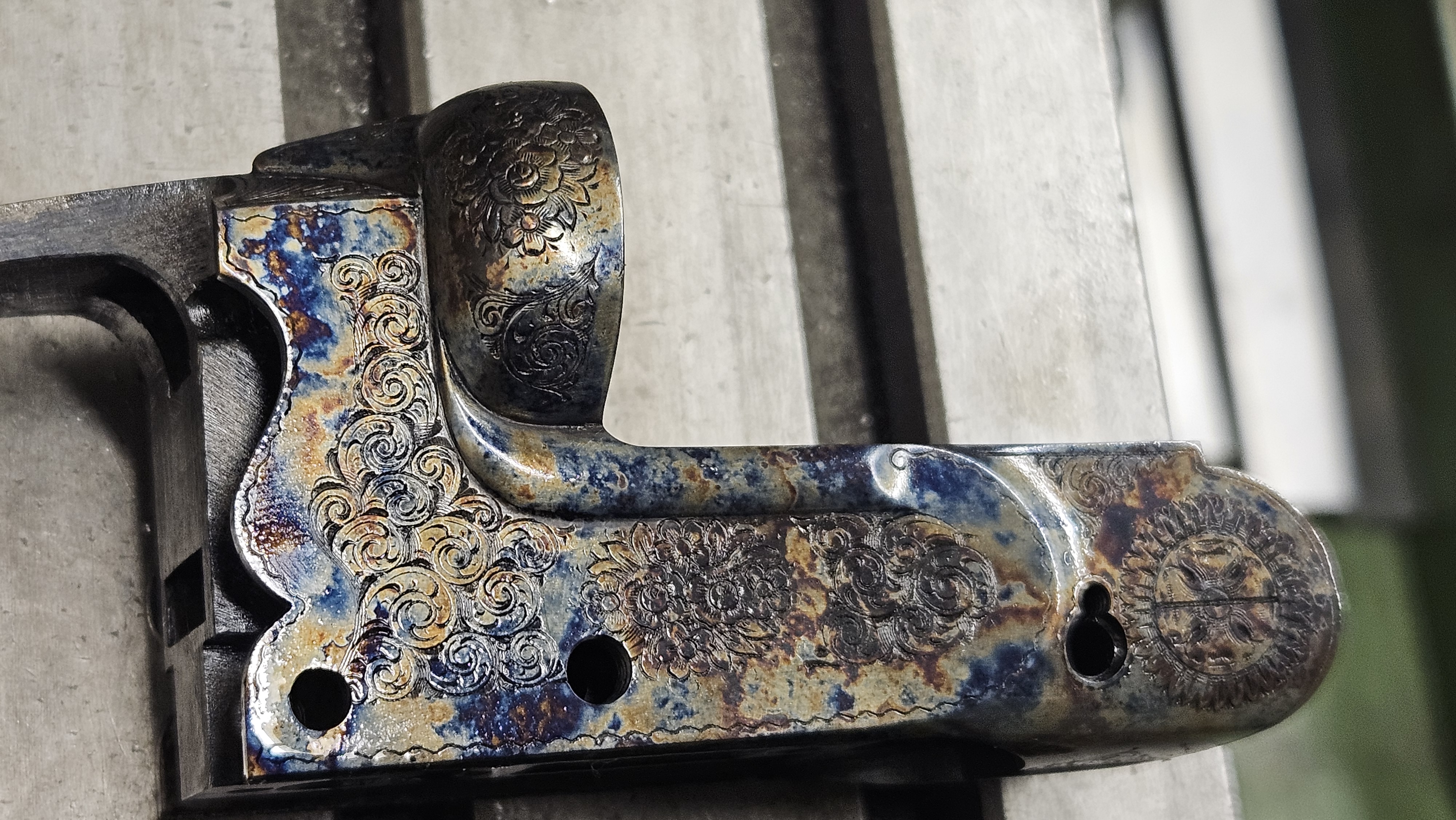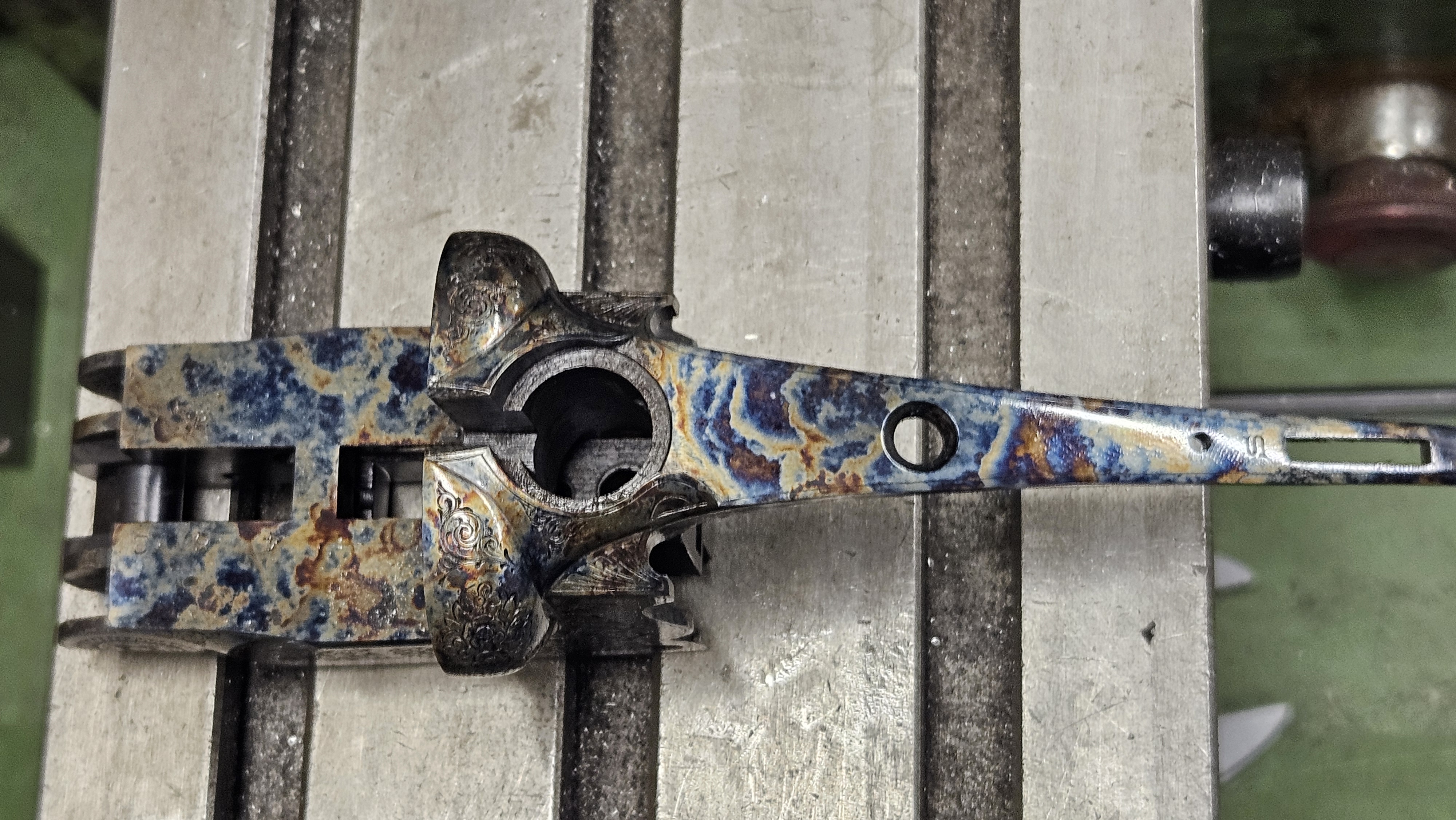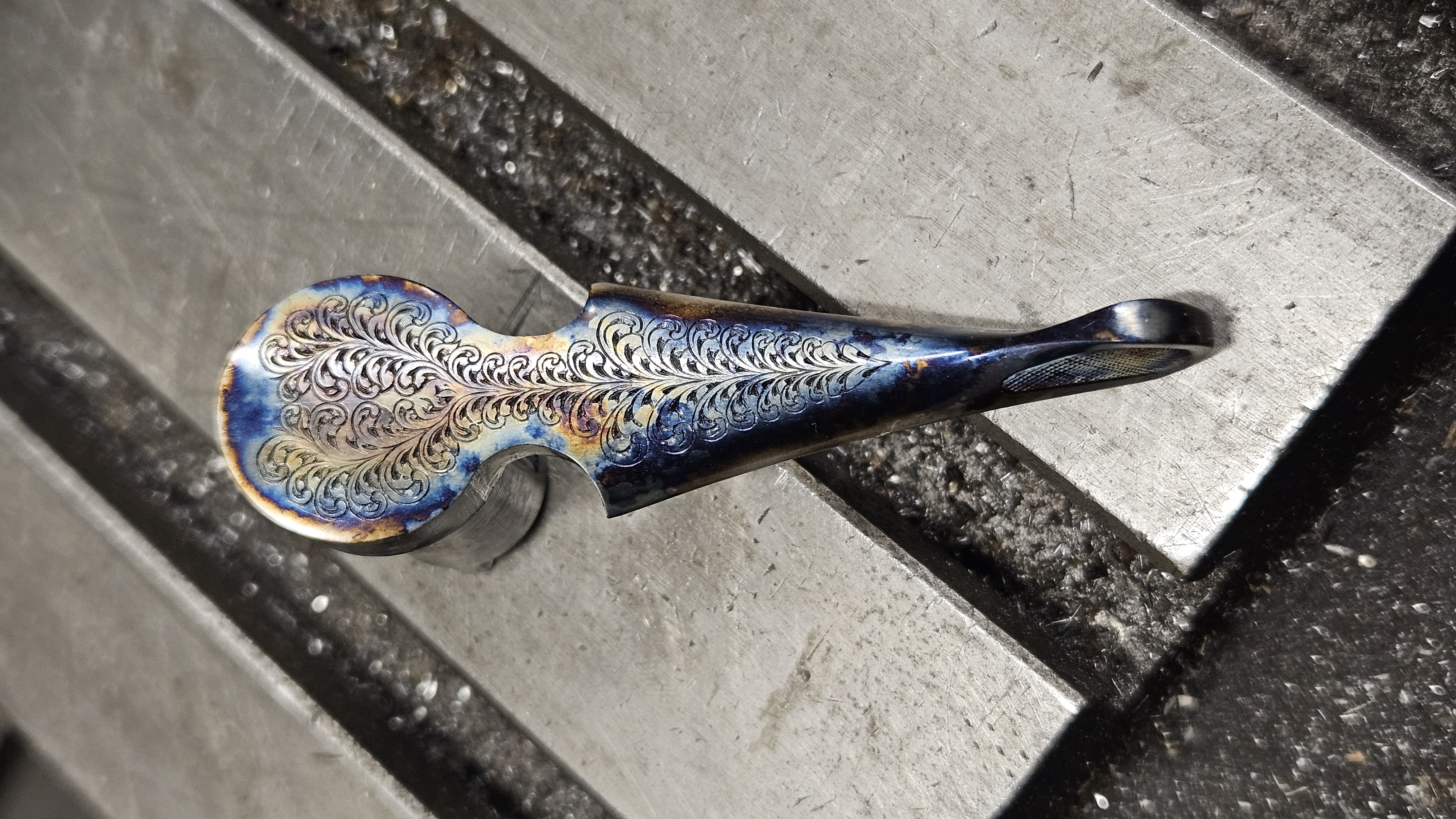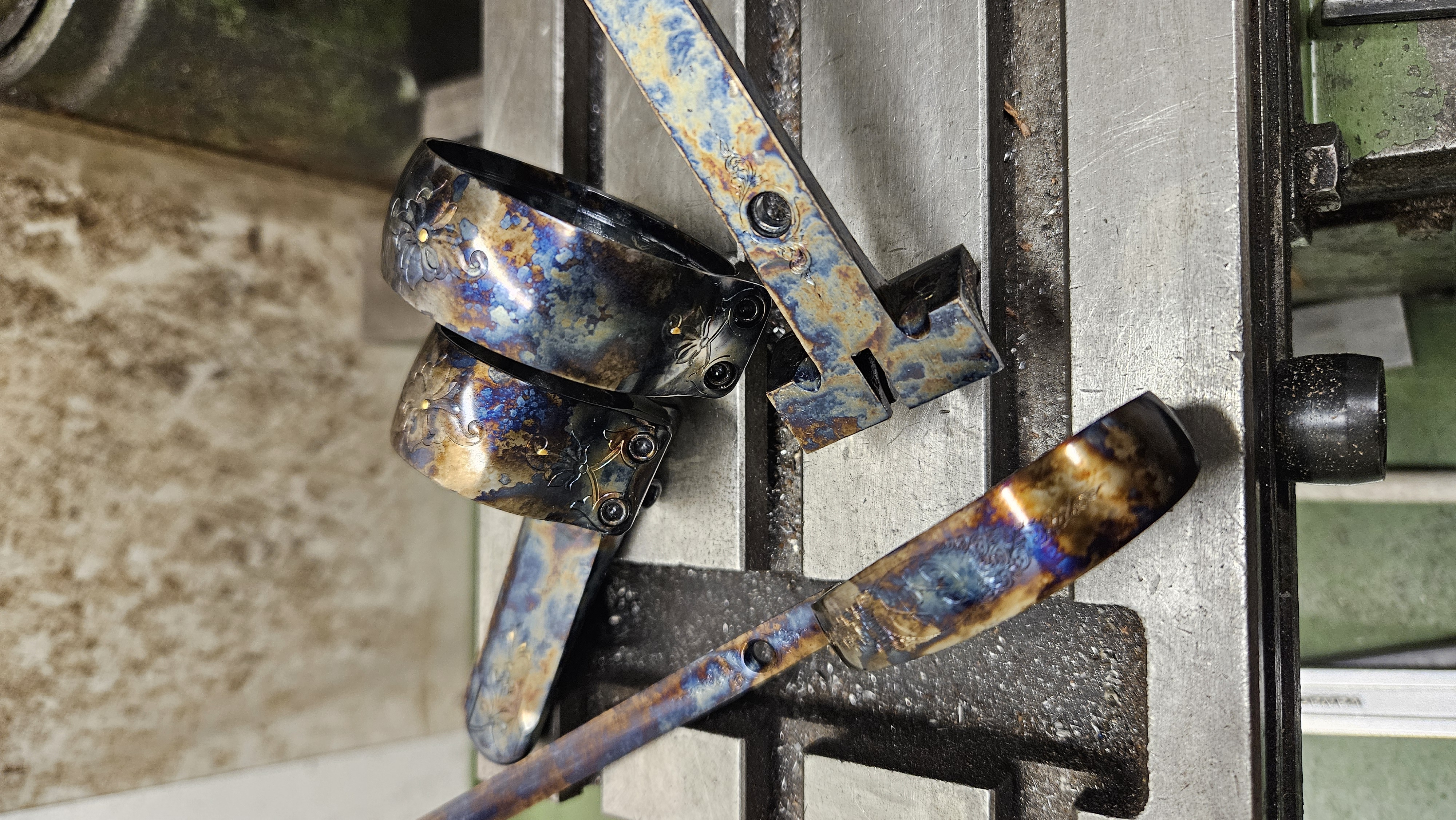En plus d'améliorer la résistance mécanique des pièces en acier, le jaspage aux sels permet de faire apparaitre de magnifiques irisations à la surface de l'acier.