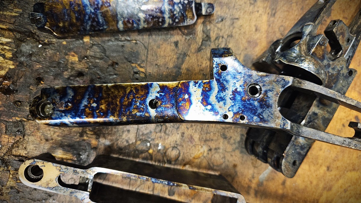 Procédé de traitement thermique très utilisé en armurerie, nous réalisons en interne la trempe jaspée aux sels ou la trempe gris vieil argent sur toutes vos pièces d'armes.