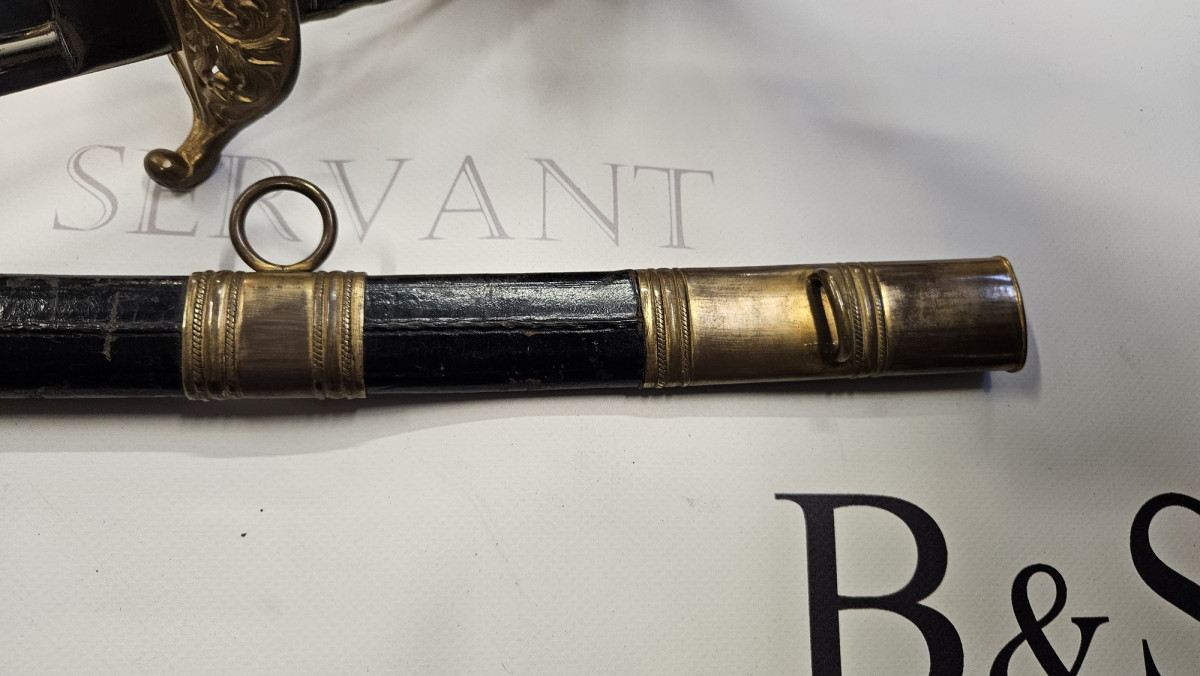 Fourreau cuir noir avec garnitures laiton doré, ciselé coté apparent.